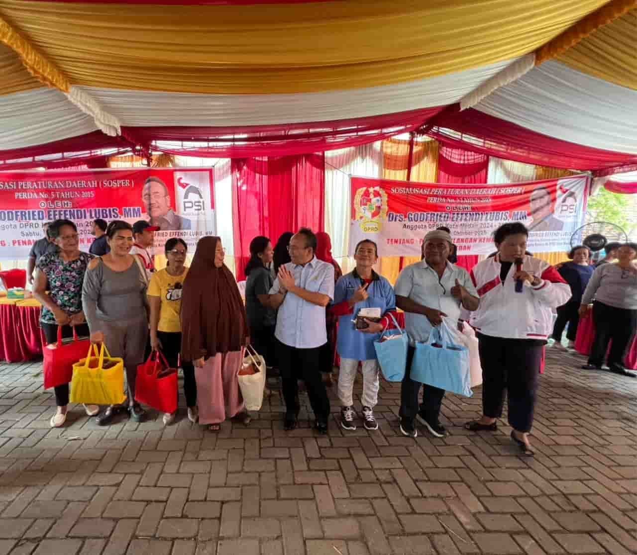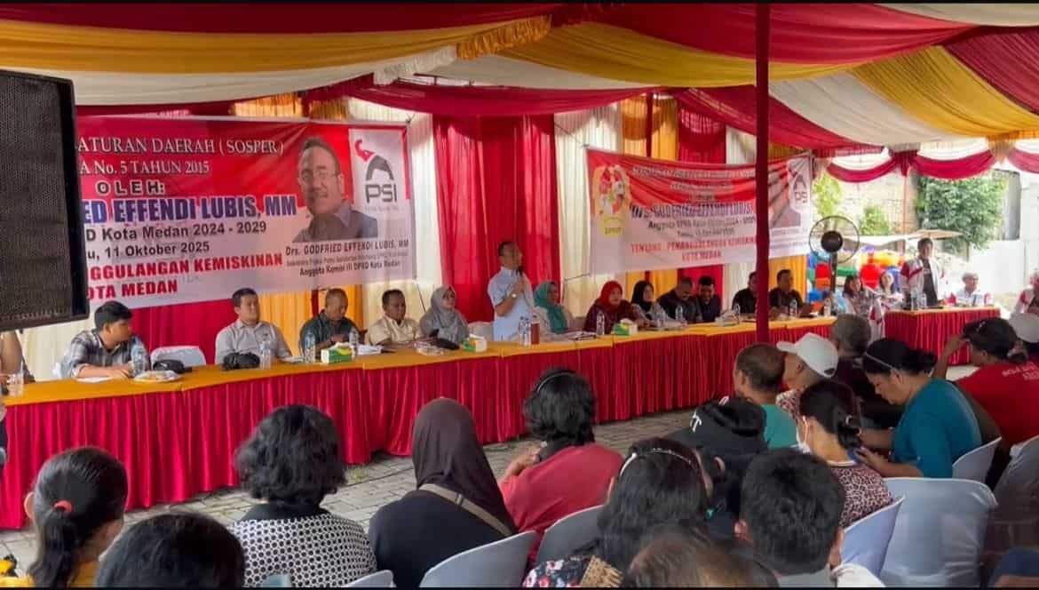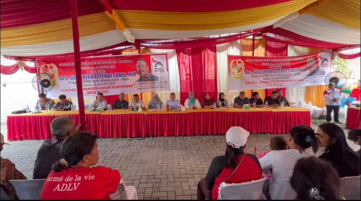 MEDAN, samudrakabar.com – Seribuan warga memadati halaman Jalan Sisingamangaraja Gang Kasih, Lingkungan III, Kelurahan Sudirejo II, Kecamatan Medan Kota, Sabtu (11/10/2025). Antusiasme masyarakat terlihat tinggi saat menghadiri Sosialisasi Peraturan Daerah (Sosperda) Nomor 5 Tahun 2015 tentang Penanggulangan Kemiskinan Kota Medan, yang digelar anggota DPRD Medan Drs. Godfried Effendi Lubis, M.M dari Partai Solidaritas Indonesia (PSI).