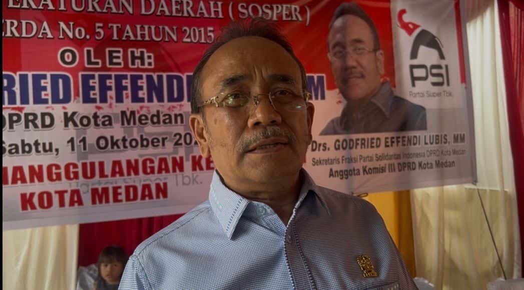 Anggota DPRD Medan dari Partai Solidaritas Indonesia (PSI), Drs. Godfried Effendi Lubis, M.M, memberikan keterangan kepada wartawan usai kegiatan Sosialisasi Perda Nomor 5 Tahun 2015 tentang Penanggulangan Kemiskinan, di Kelurahan Sudirejo II, Kecamatan Medan Kota, Sabtu (11/10/2025). (samudrakabar.com/Foto: Arya).