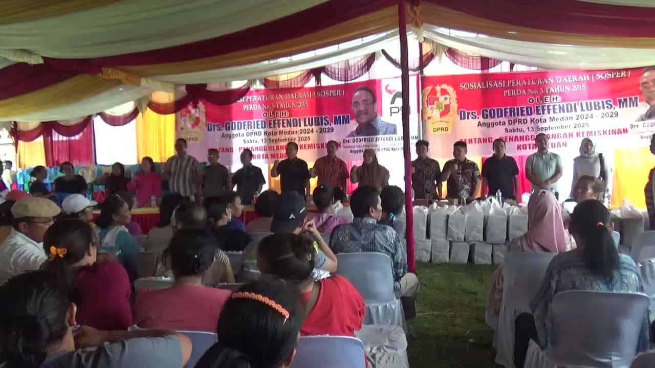 Medan, samudrakabar.com – Lapangan Asrama Polisi di Jalan HM Joni Pasar Merah, Lingkungan XV, Kelurahan Binjai, Kecamatan Medan Denai, dipadati warga pada Sabtu (13/9/2025). Kehadiran masyarakat ini untuk mengikuti Sosialisasi Perda No. 5 Tahun 2015 tentang Penanggulangan Kemiskinan Kota Medan yang digelar oleh anggota DPRD Medan, Drs Godfried Effendi Lubis, M.M dari Fraksi PSI.